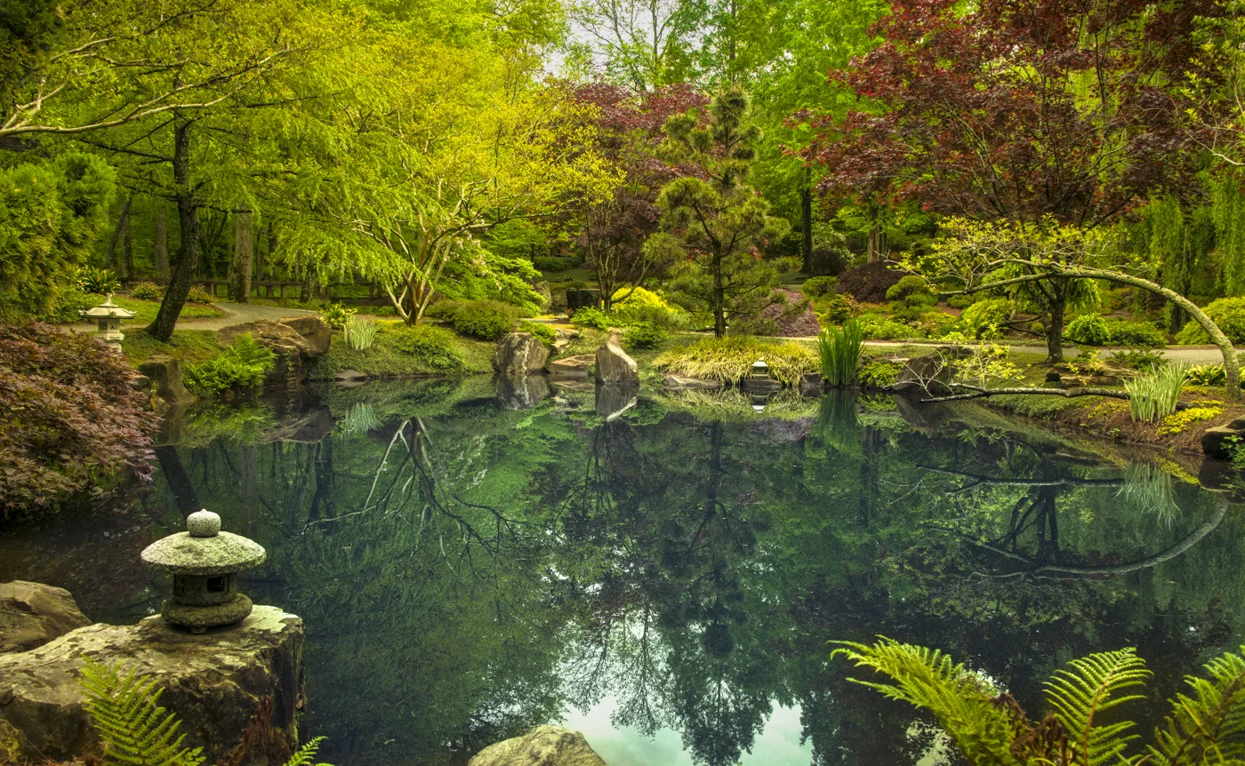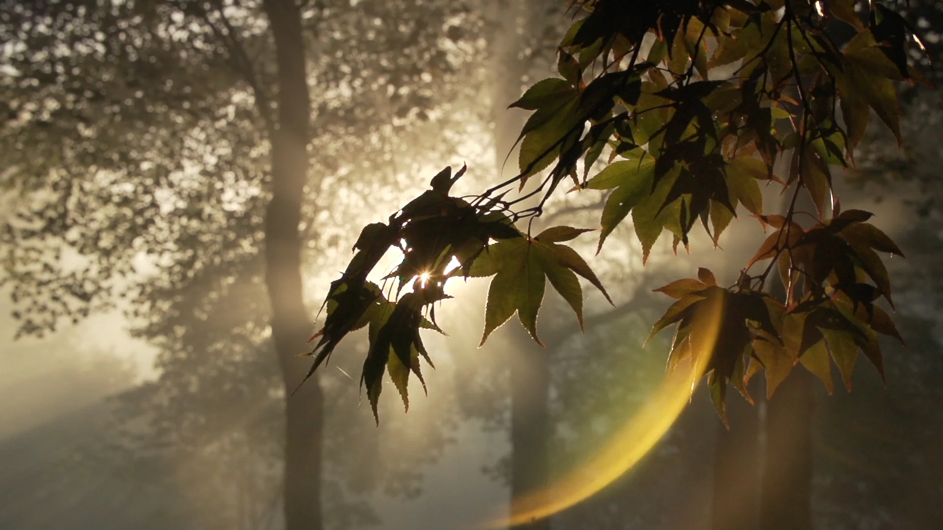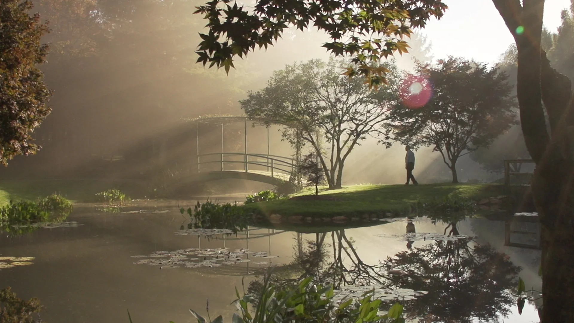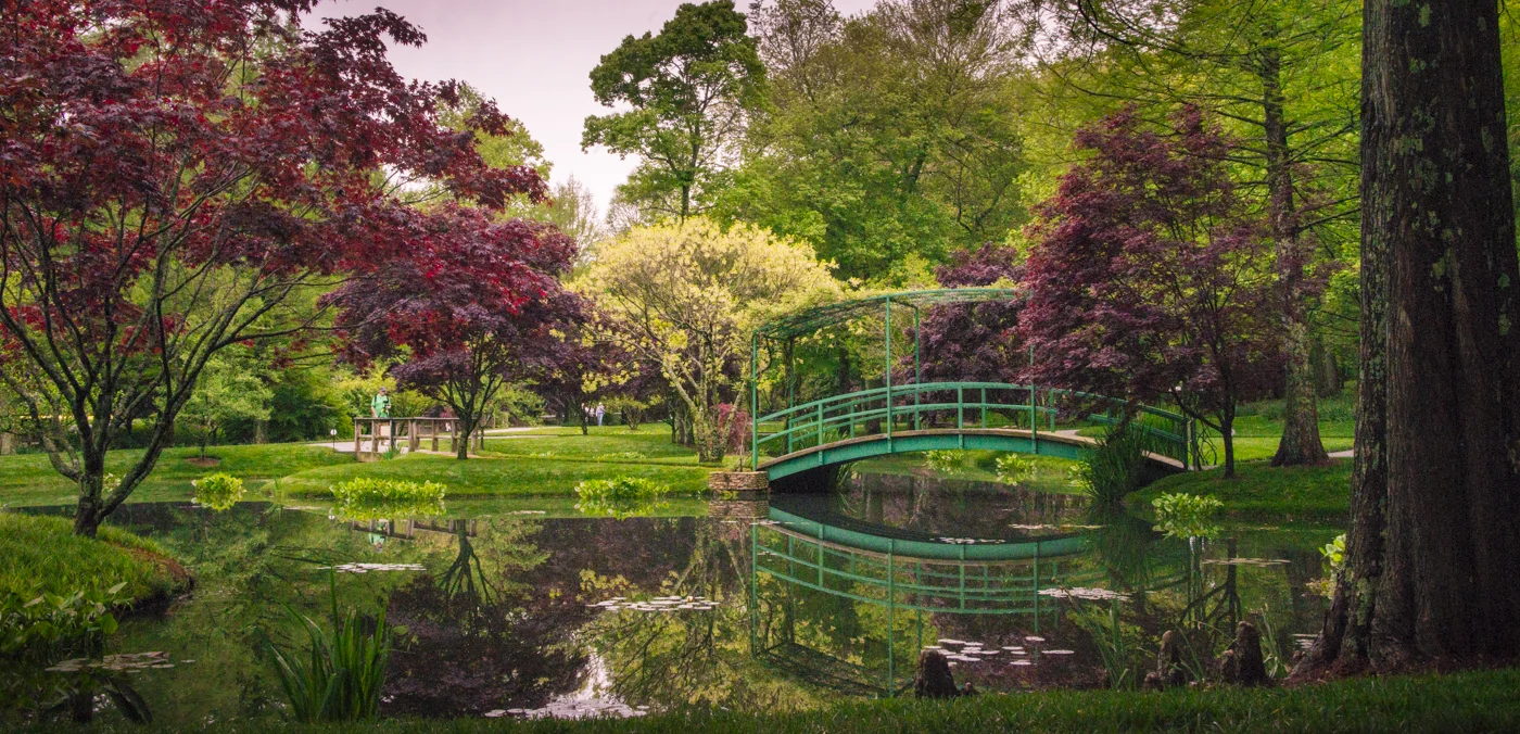 Morning breaks through the trees at Gibbs Garden in Ball Ground, GA