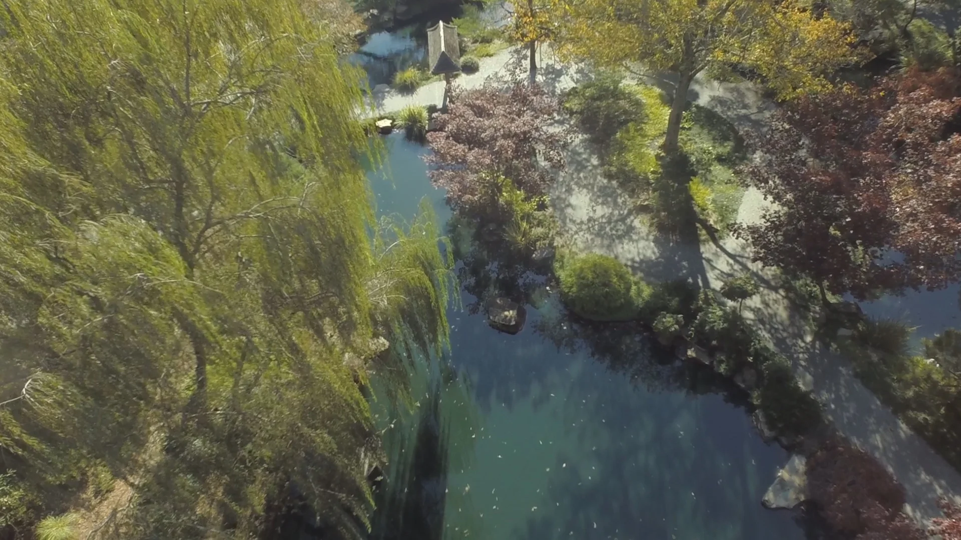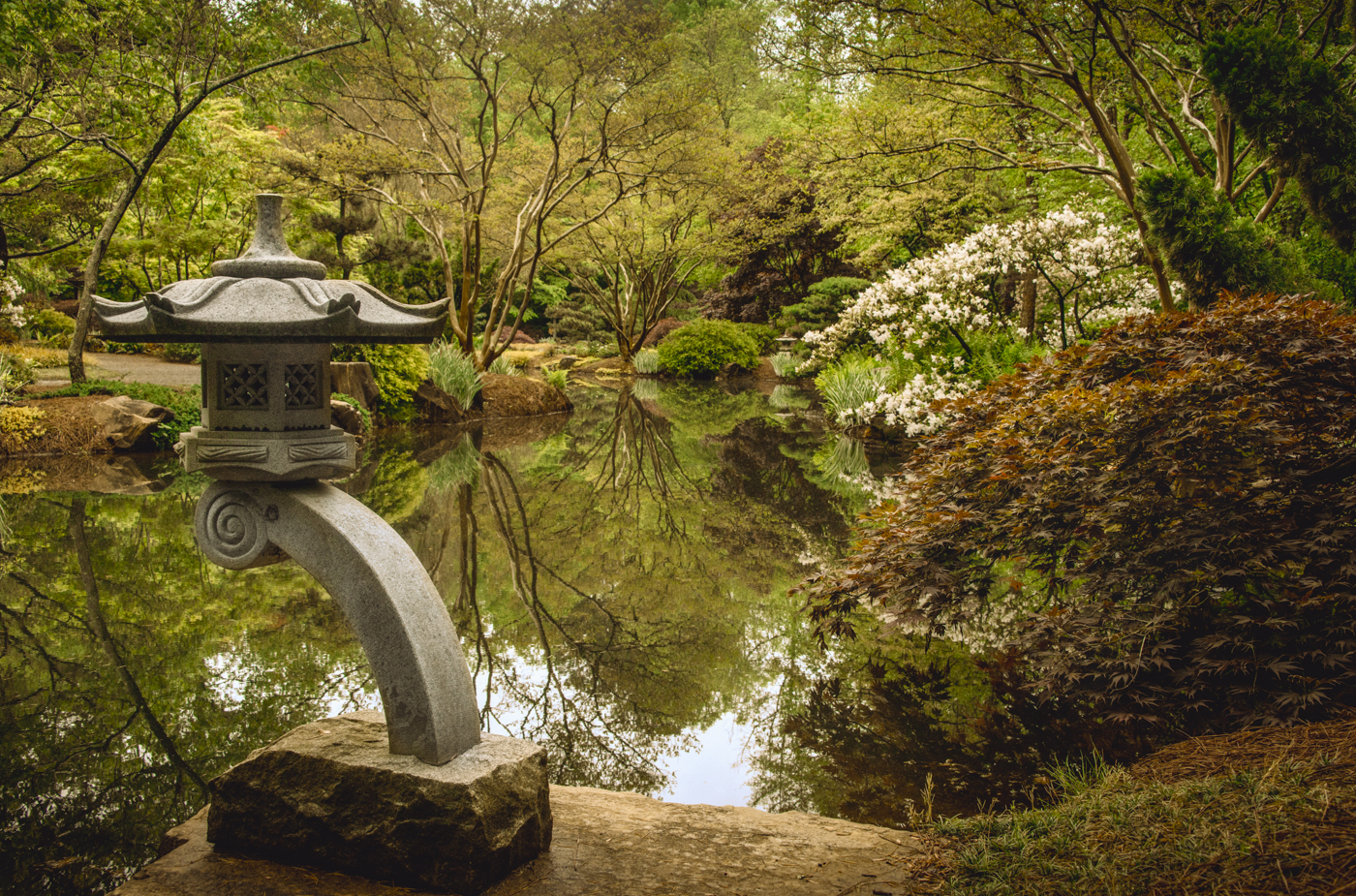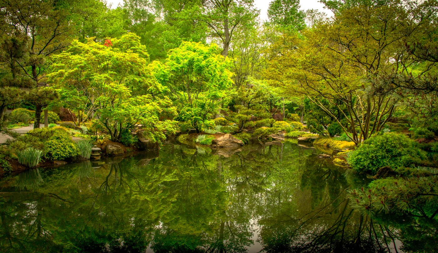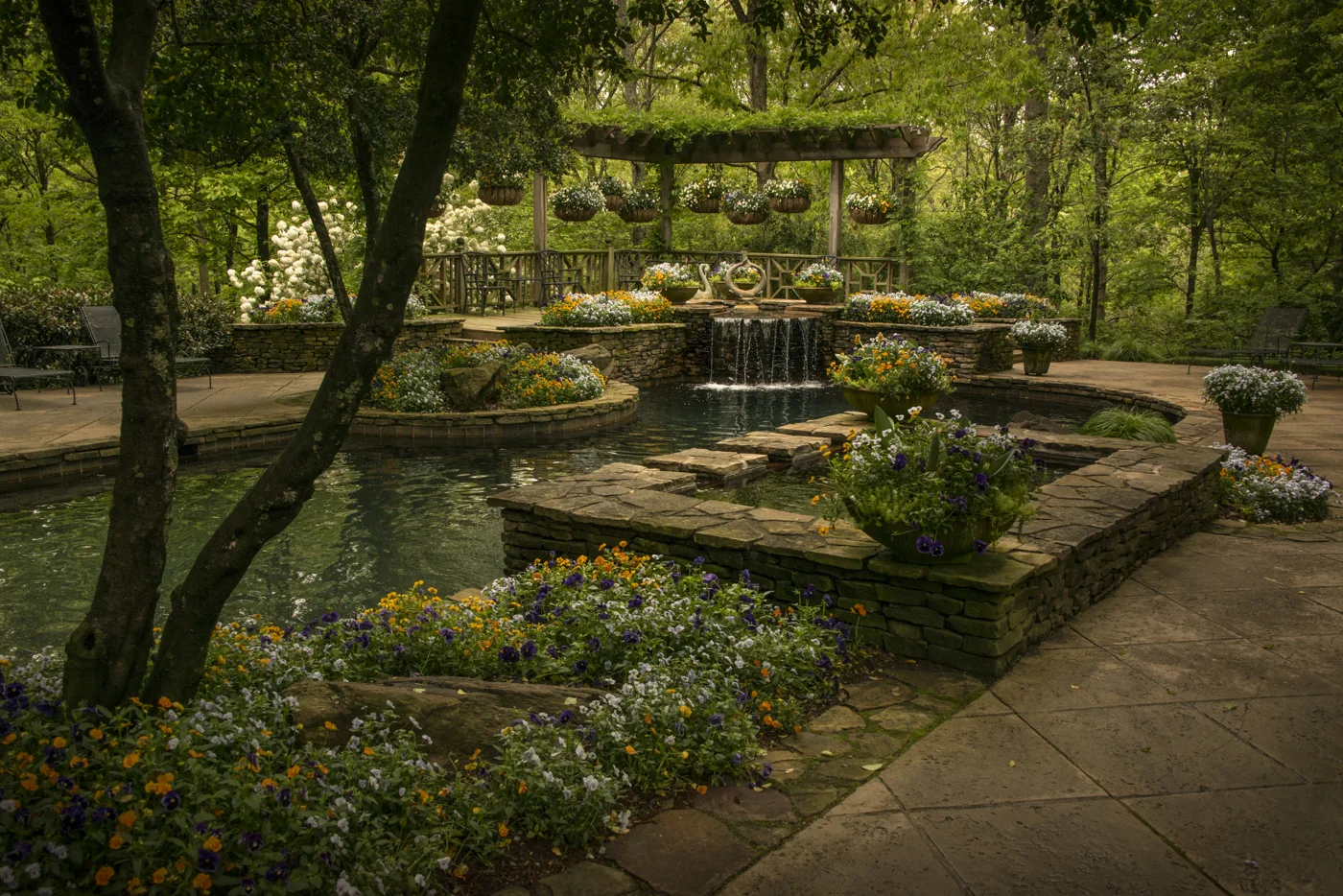 Morning breaks through the trees at Gibbs Garden in Ball Ground, GA